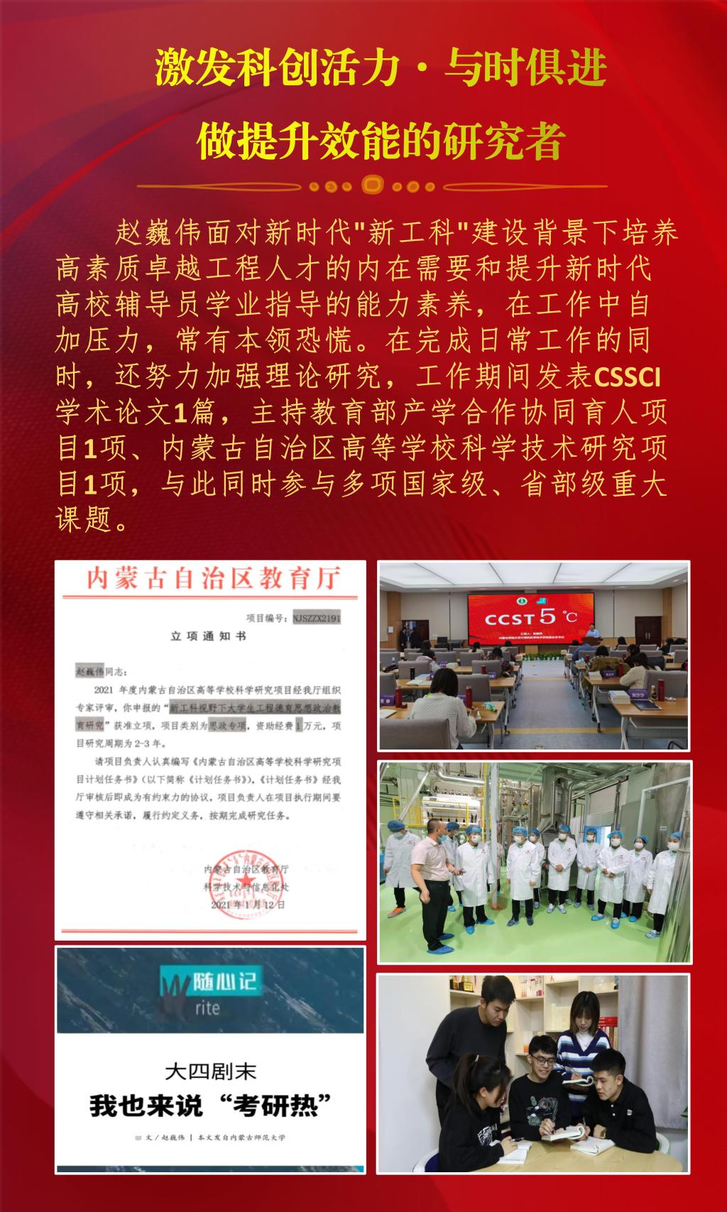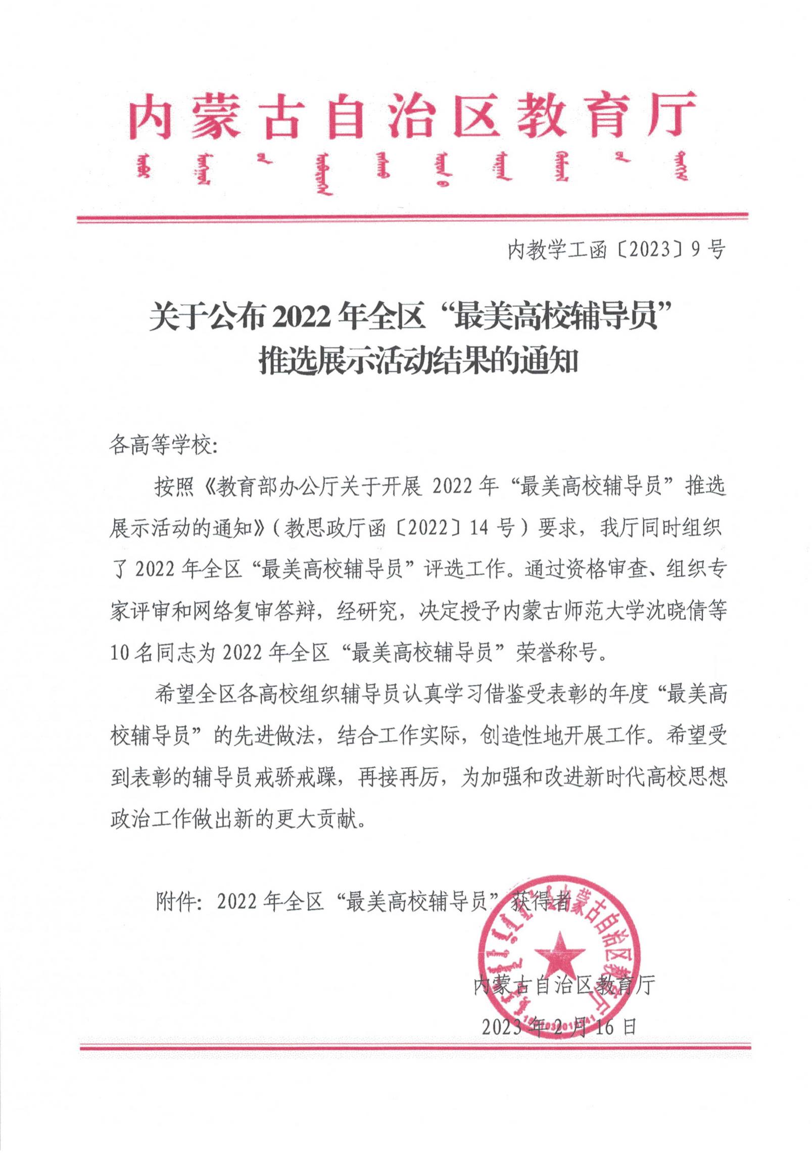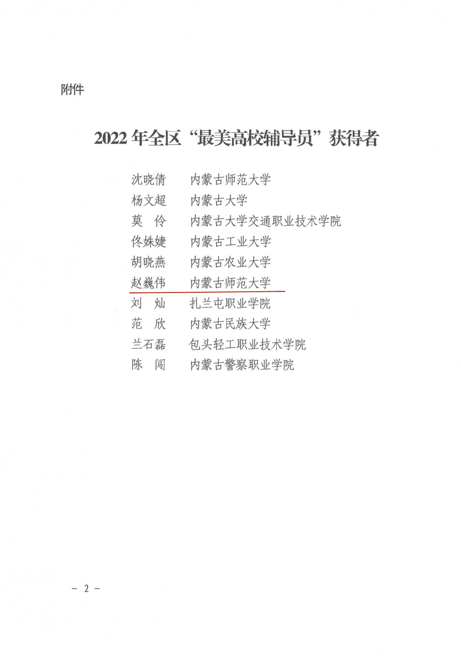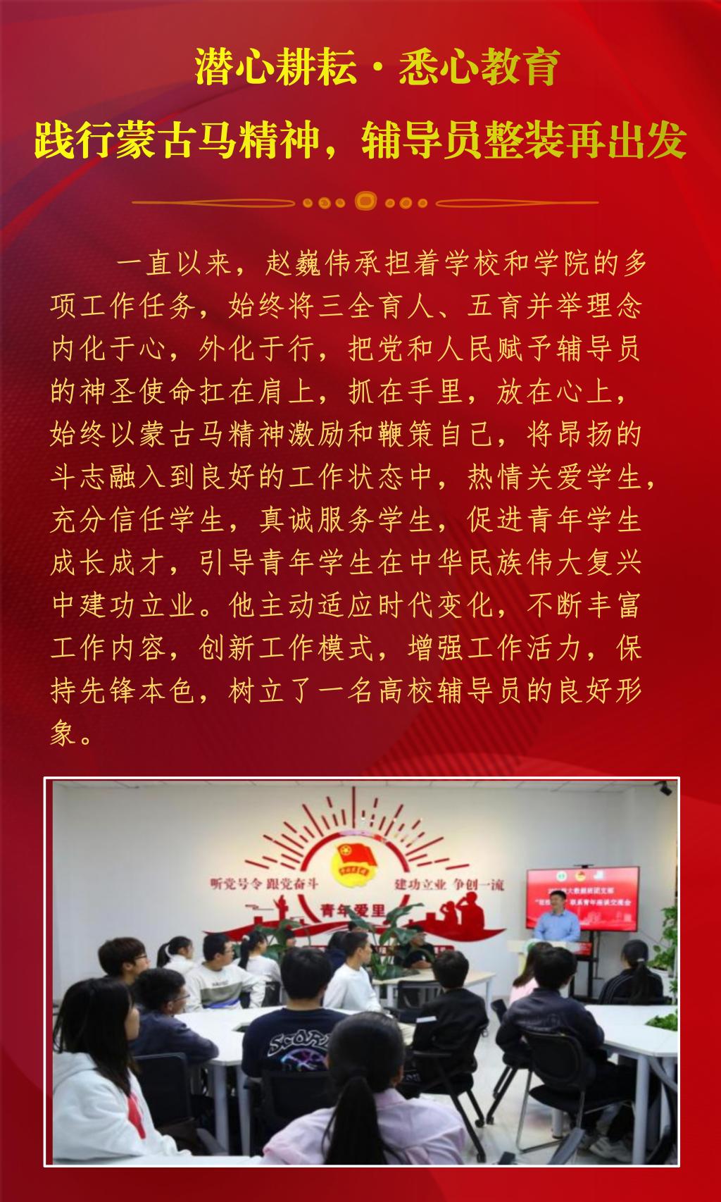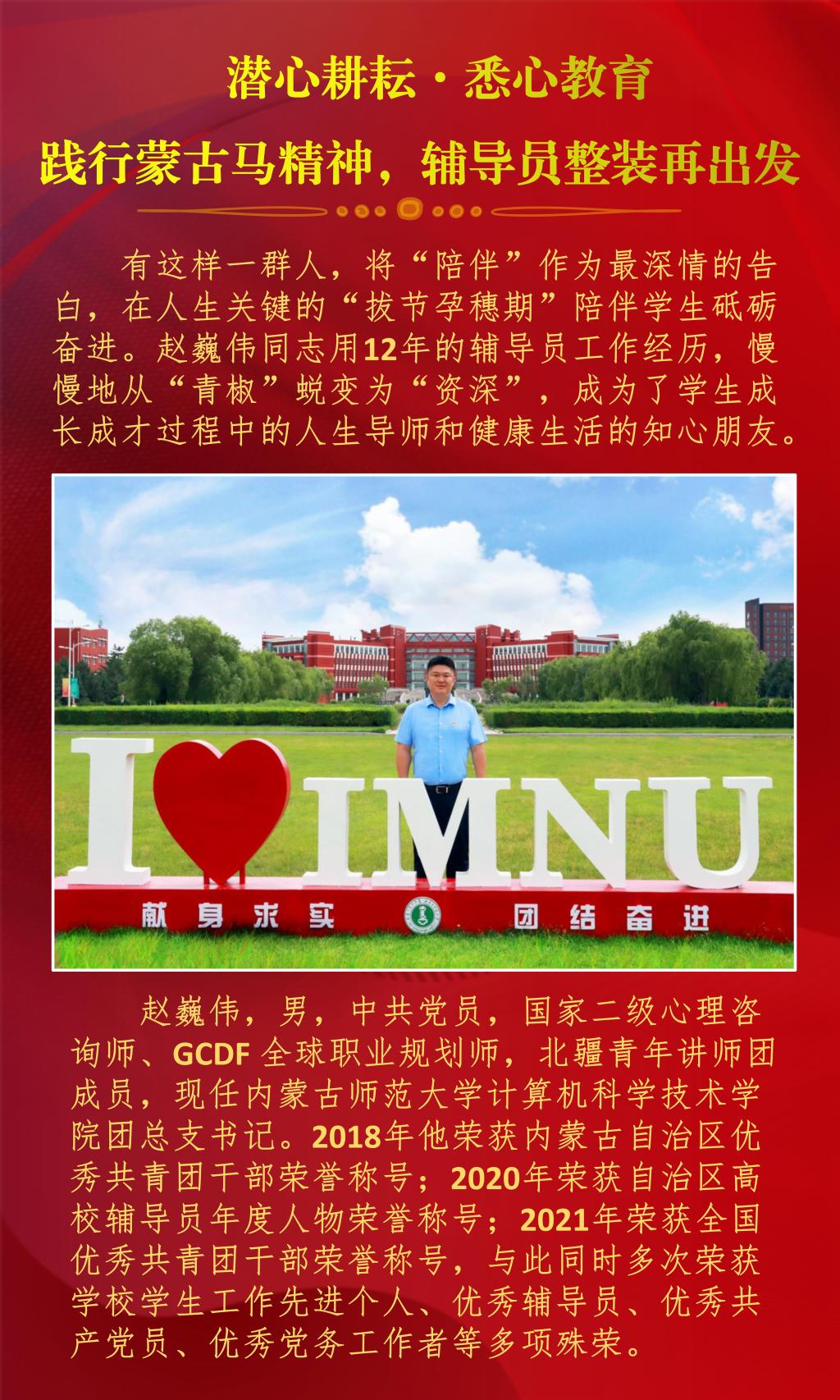 近日,内蒙古自治区教育厅公布了2022年全区最美高校辅导员推选展示活动的结果,经过资格审查、组织专家评审和网络复审答辩,授予10名辅导员“2022年全区最美高校辅导员荣誉称号”。新葡萄官网辅导员赵巍伟获此项荣誉。