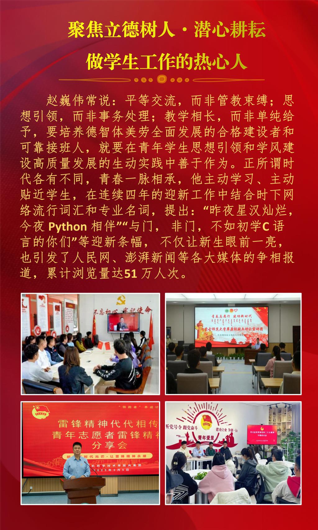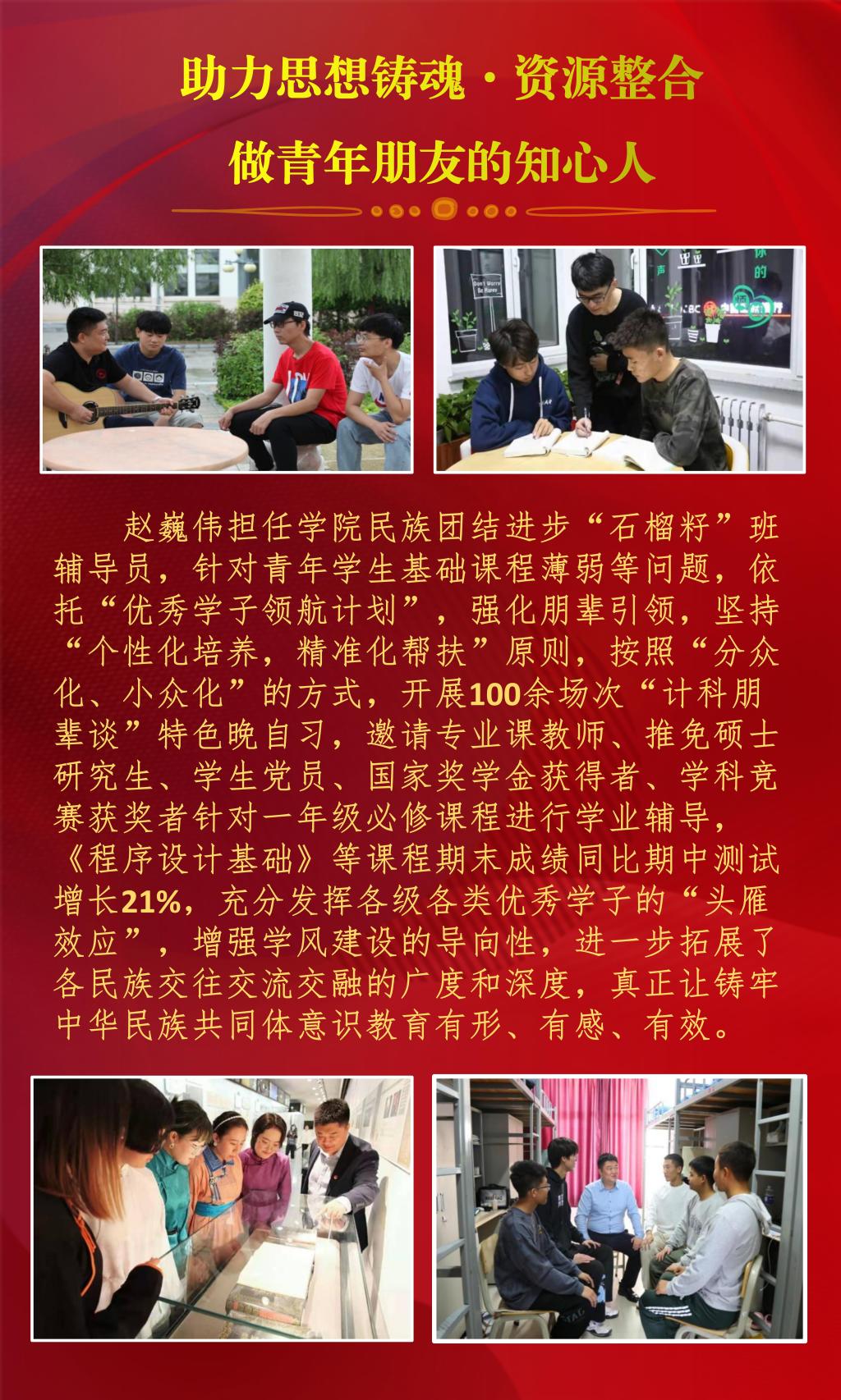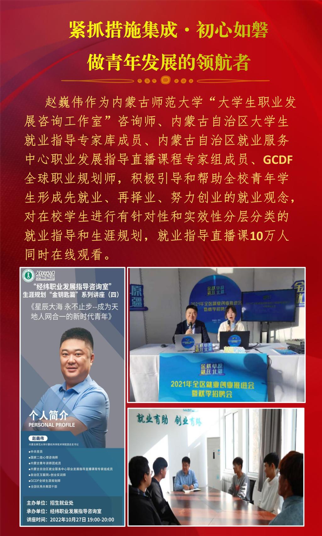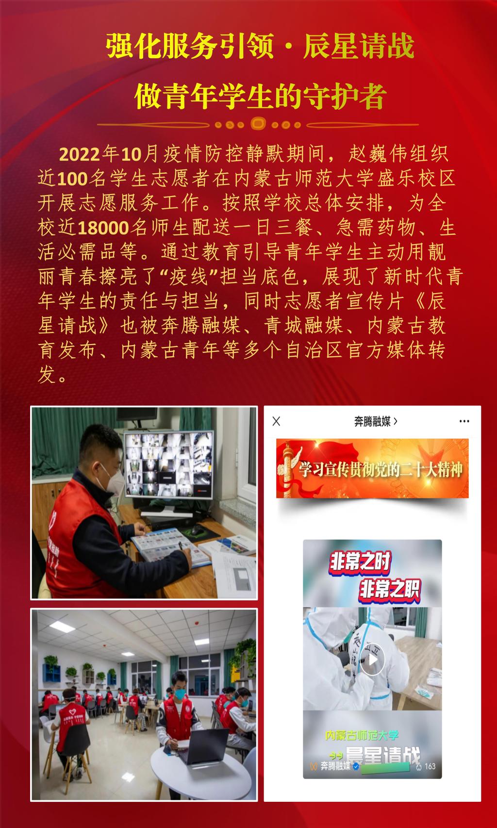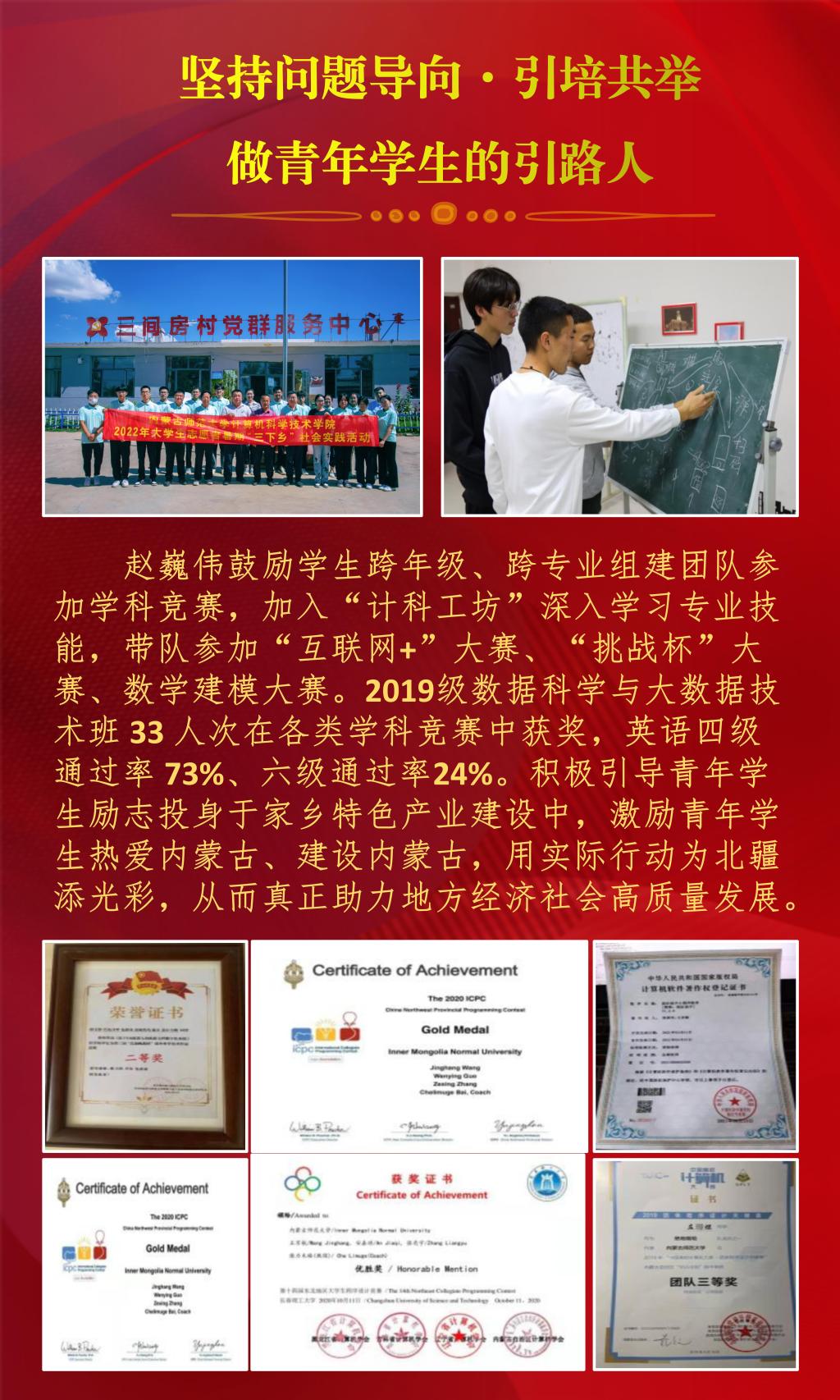 近日,内蒙古自治区教育厅公布了2022年全区最美高校辅导员推选展示活动的结果,经过资格审查、组织专家评审和网络复审答辩,授予10名辅导员“2022年全区最美高校辅导员荣誉称号”。新葡萄官网辅导员赵巍伟获此项荣誉。