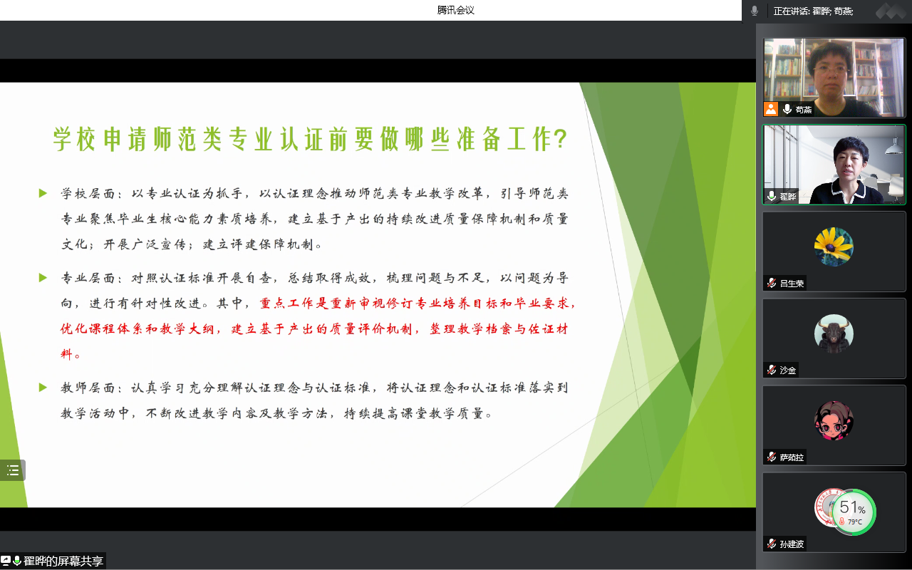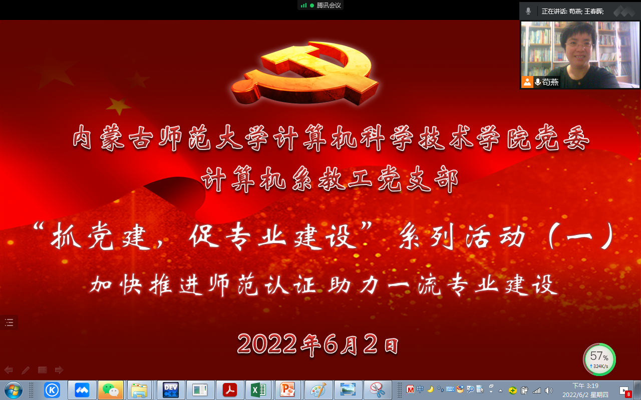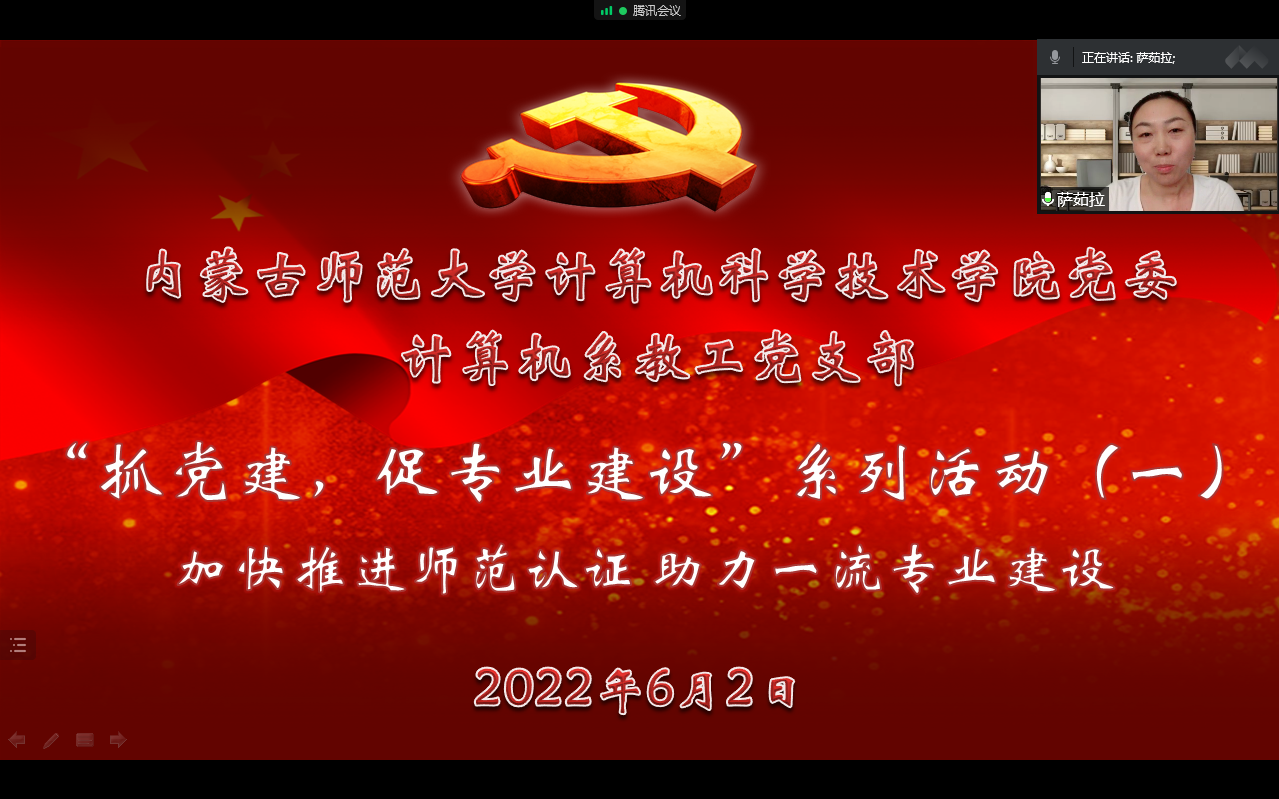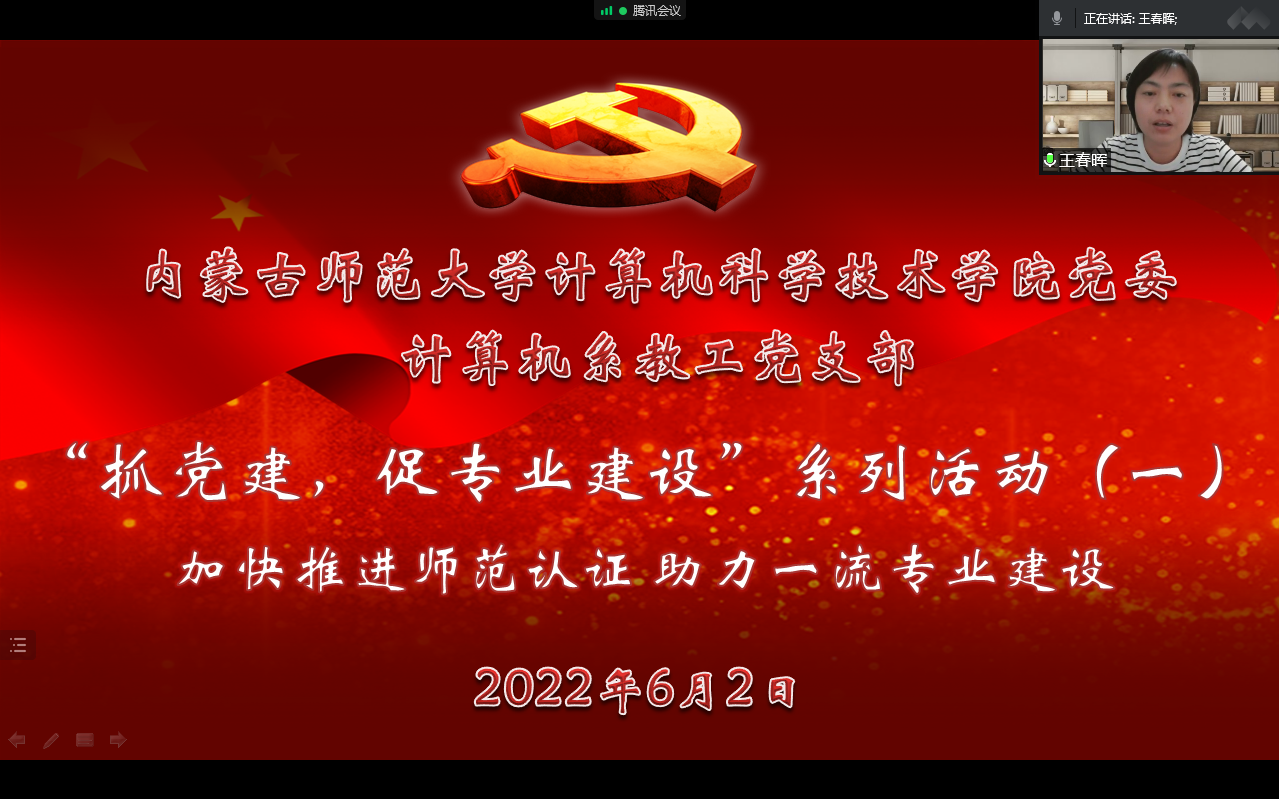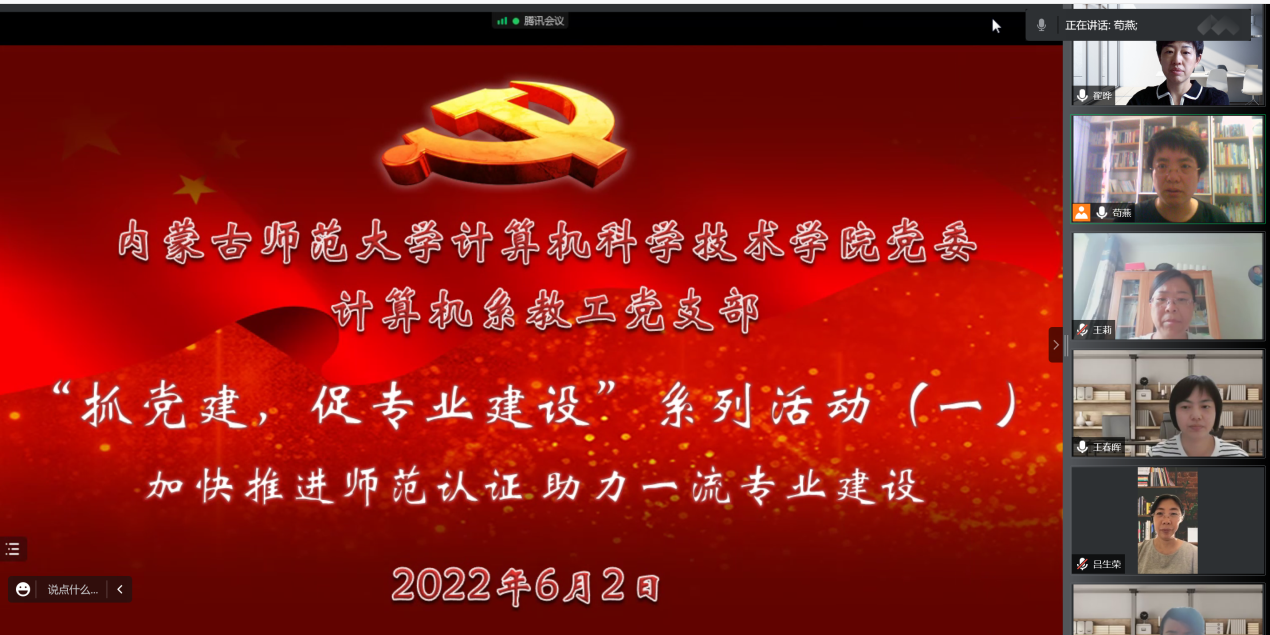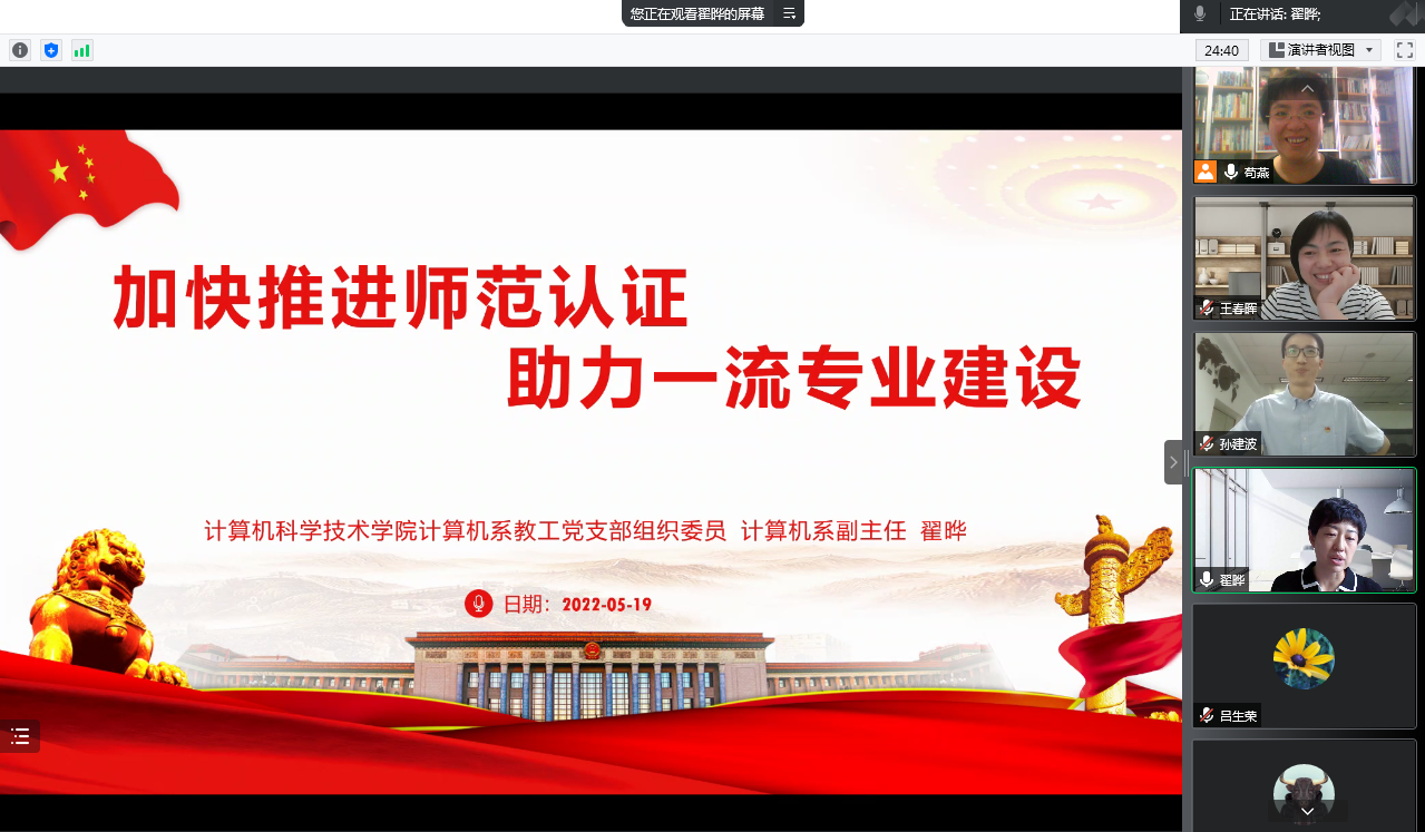 会上,计算机系党支部组织委员、计算机系副主任翟晔围绕新葡萄官网师范认证工作了详细汇报。首先回顾了新葡萄官网师范认证的前期准备工作、汇报了目前新葡萄官网师范认证的进展情况并介绍了下一步的工作计划,最后强调了师范认证作为新葡萄官网今年的头等要务,需要每一位老师的鼎力支持和全力配合。汇报之后,老师们和系主任围绕师范认证的重要性和目前存在的困难进行了激烈的讨论和交流,大家纷纷表示愿意为了攻克师范认证这个重任贡献自己的一份力量。