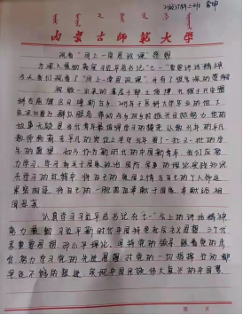 一代人有一代人的担当,一代人有一代人的长征。在内蒙古这个广袤的大地上,涌现出无数有志青年去投身去中华民族振兴的伟大事业中。作为新时代的青年,我们更应该去继承中华民族伟大精神,肩负我们这代人的担当,走好我们这代人的长征路。我们应该向王俊博学习,筑牢中华民族共同体意识,维护各民族的利益,为建设靓丽内蒙,强大祖国贡献自己的一份力量。我们生于一个伟大的时代,享有人生出彩的机会,我们享有机会,但同样我们肩负使命,我们要与国家人民共同前行,贡献我们一份力量。