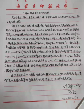 此次思政课的学习,是一场生动的思想政治理论示范课,教育我们传承和弘扬爱国主义精神,在中国特色社会主义思想的生动实践中充分感受中国共产党领导和中国特色社会主义制度的显著优势,引导学生坚定,自信的交出一份青春担当的满意答卷。