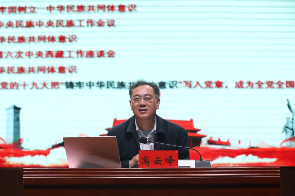 高云峰研究员从理论内涵、历史脉络、政治要求、政策表述等多个角度,深入浅出地解读了铸牢中华民族共同体意识、推行国家统编教材使用和推进通用语言文字教育的重要意义,详细解答了“怎么看”和“怎么办”两个问题。高云峰强调,各位入党积极分子要认真领会铸牢中华民族共同体意识的深刻内涵,不折不扣的贯彻党和国家的方针政策,坚决推行国家统编教材使用和国家通用语言教育,真正做到“两个维护”,做“铸牢中华民族共同体意识”坚定的维护者和忠实的践行者,凝聚起同心共筑伟大中国梦的磅礴力量,为庆祝中国共产党成立一百周年奉献青春力量。